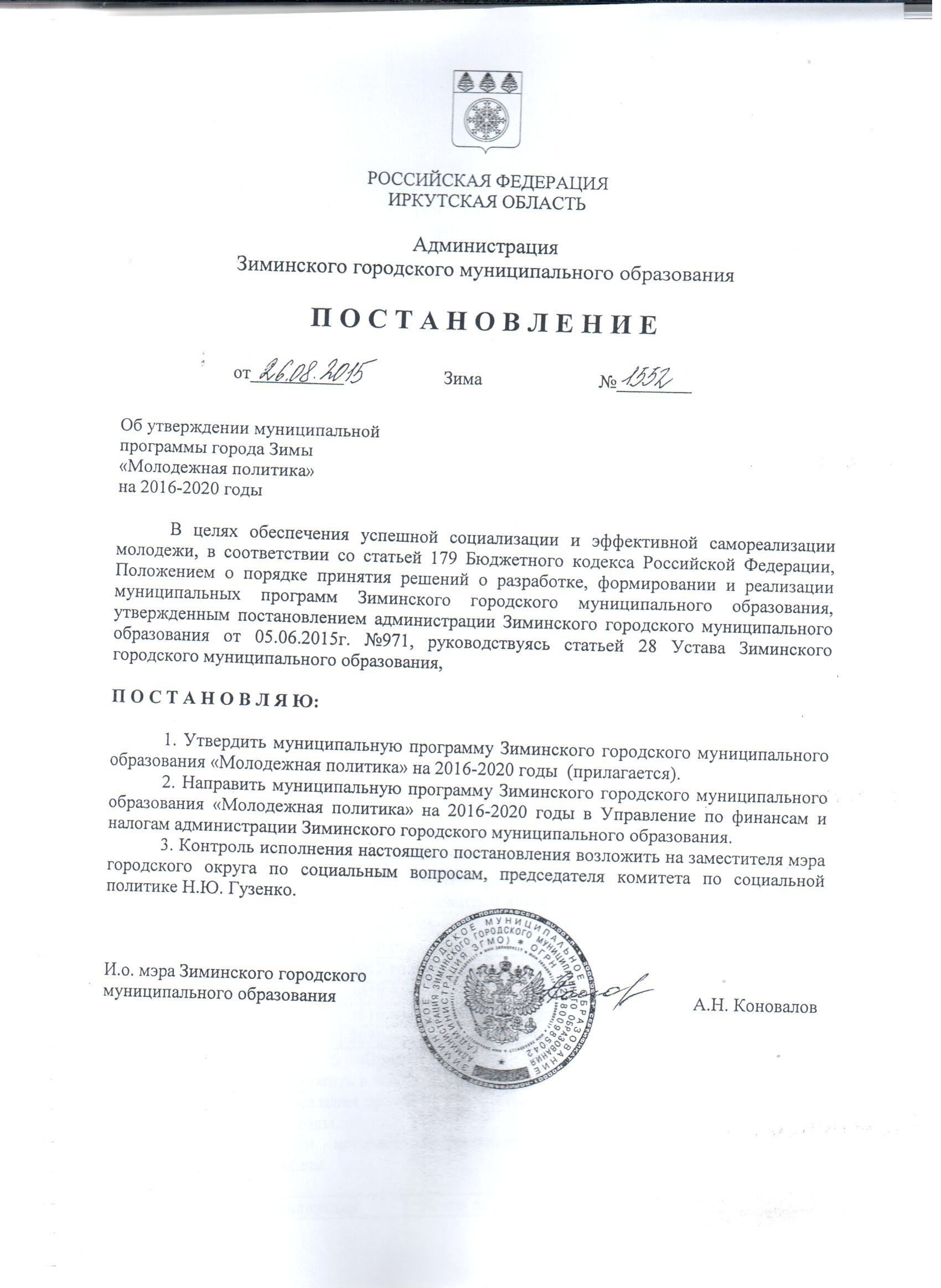 Постановление администрации ЗГМО от 26.08.2015 г. 1552 "Об утверждении МП " Молодежная политика"
