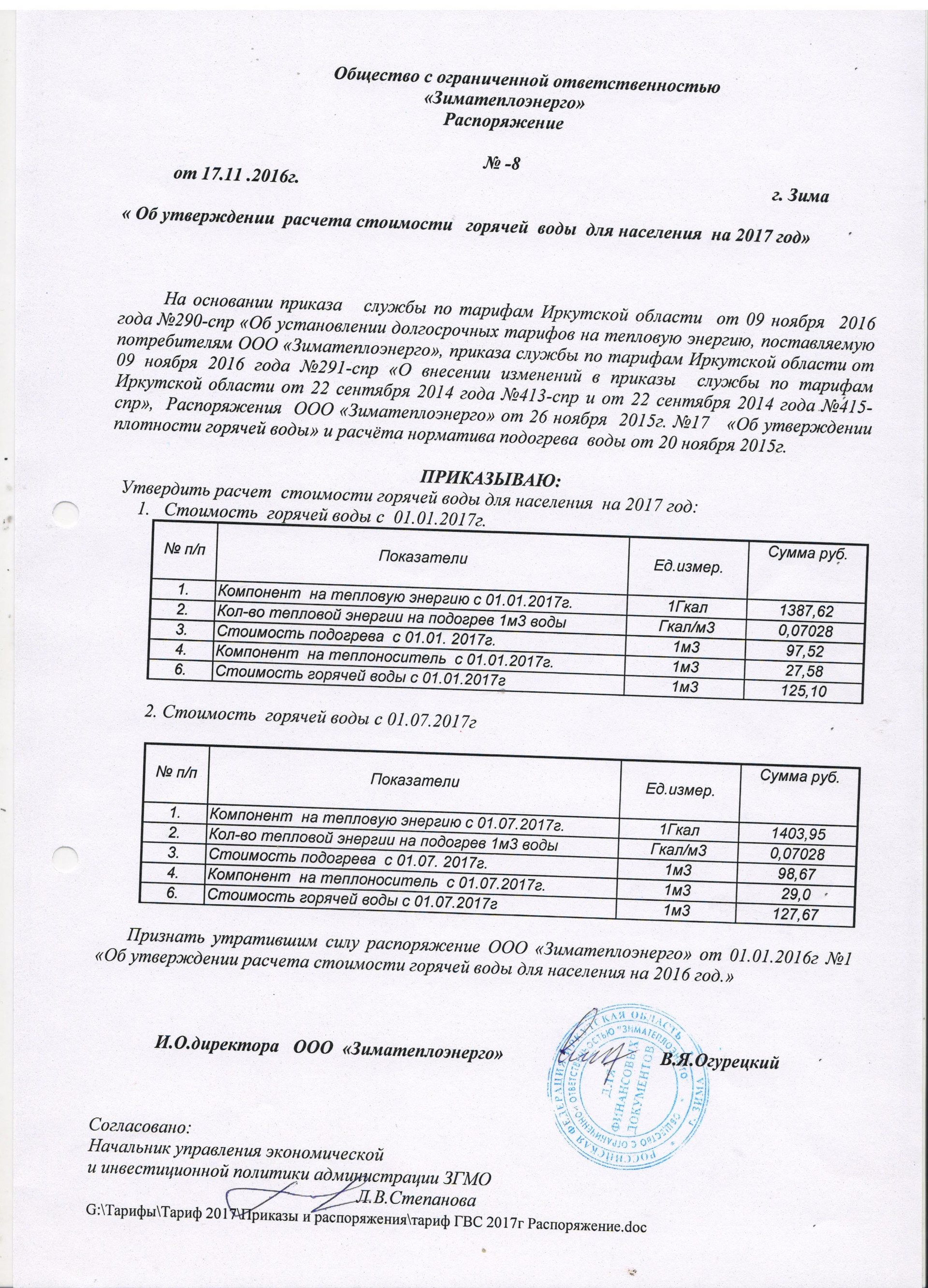 Постановление от 17.11.2016г. №8 Об утверждении расчёта стоимости горячей воды для населения на 2017 год