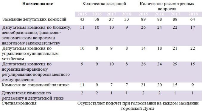 Работа городской Думы носит коллегиальный характер, и первой ступенью принятия консолидированного решения являются постоянные комиссии, полномочия которых позволяют охватить все вопросы местного значения, установленные Уставом города Зимы. За отчетный период проведено 33 заседания, рассмотрено 64 вопроса. Некоторые вопросы для более качественного изучения и принятия правильного решения рассматривались на различных депутатских комиссиях, схожих по профилю деятельности, что впоследствии при направлении их на рассмотрение Думы исключало ошибки при принятии решений.
