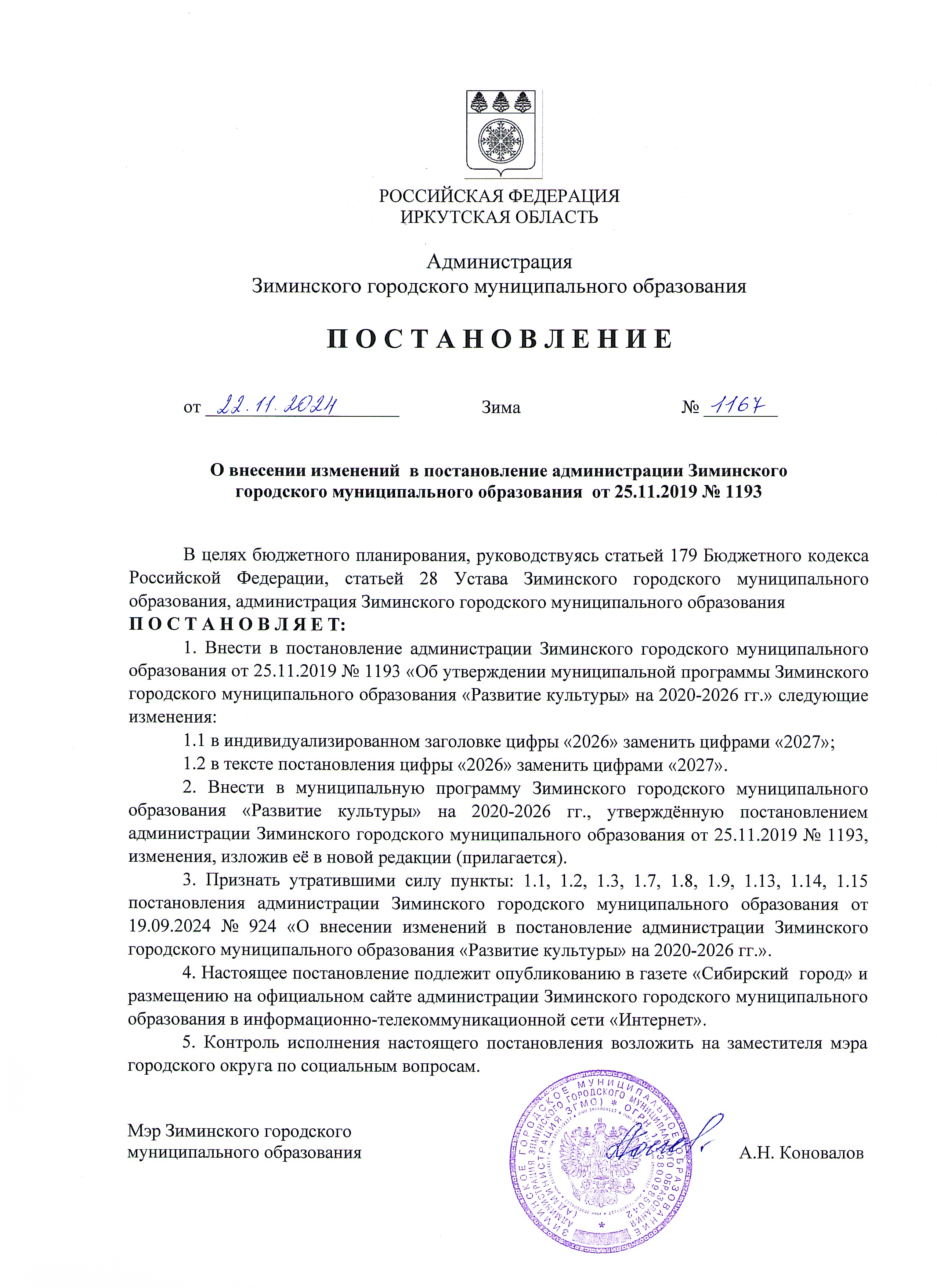 Постановление администрации ЗГО от 02.10.2025 № 1106 "О внесении изменений в муницпальную программу Зиминского городского муниципального образования "Развитие культуры" на 2020-2027 гг."