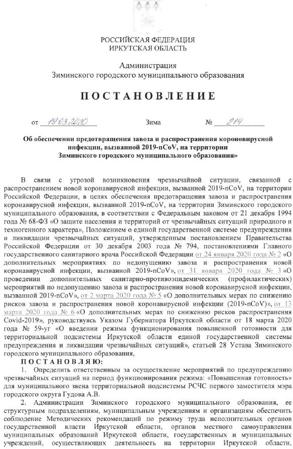 Постановление №214 "Об обеспечении предотвращения завоза и распространения коронавирусной инфекции на территории ЗГМО"