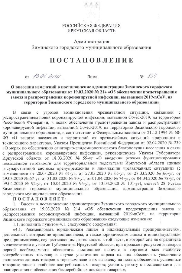 Постановление №334 о внесении изменений в постановление администрации ЗГМО №214 от 13.04.2020