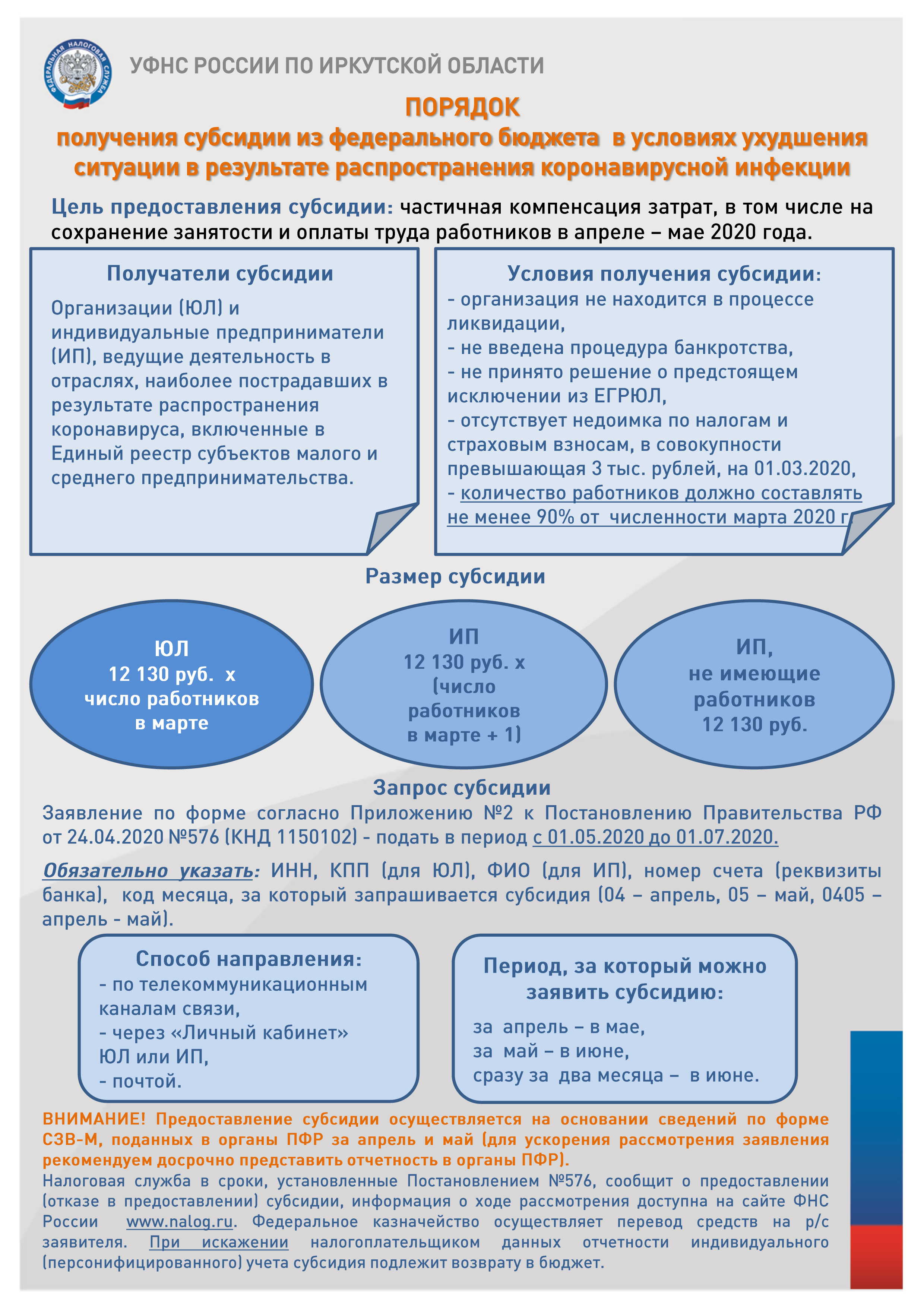 Внимание!Предоставление субсидии осуществляется на основании Сведений о застрахованных лицах (форма СЗВ-М), поданных в органы ПФР за апрель и май 2020 года (для ускорения рассмотрения заявления рекомендуем досрочно представить отчетность в органы ПФР). Налоговая служба после проверки информации, указанной в заявлении, в сроки, установленные Постановлением №576, сообщит налогоплательщику о предоставлении (отказе в предоставлении) субсидии. Информация о ходе рассмотрения доступна на сайте ФНС России